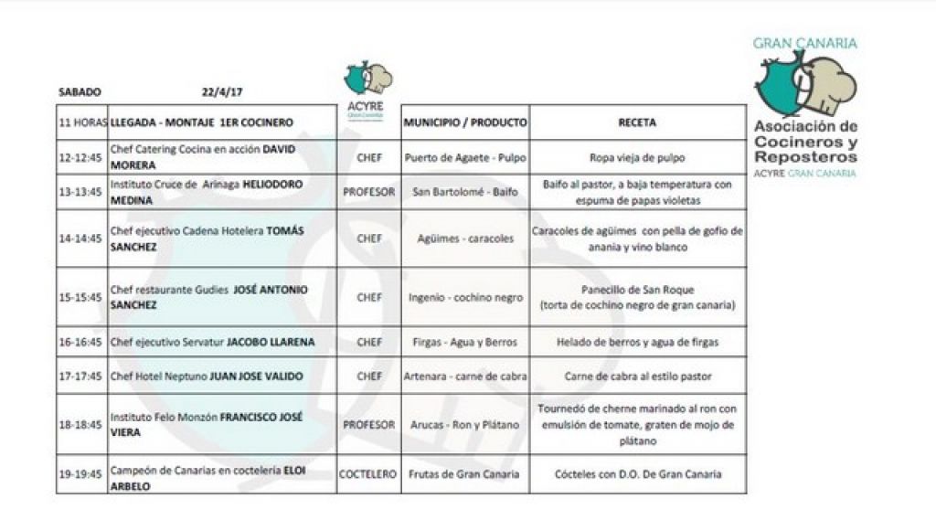 Las exhibiciones de sus propuestas, que combinan tradición e innovación, serán en el pabellón 6 y comenzarán cada día a las 12.00 horas para deleite de los visitantes. La jornada comenzará con carpaccio de camarón soldado con aguacate y mangas de Mogán, elaborado por el chef Jonay Macia (Hotel Bahía Feliz), seguido de canelón de conejo en salmorejo y bechamel de queso de Casa Pastores de Cristóbal Valido (Hotel H10 Meloneras), y atún con aguacate y wasabi, atún con pimienta negra y atún con cerezas negras y queso de cabra, todos marinados con vinos de Tejeda, elaborados por el chef Thomas Leeb (Hotel Santa Catalina y presidente de Acyre). El barista y experto en cafetales Antonio Márquez, de la Finca Los Castaños, cerrará la mañana con sus explicaciones sobre el cultivo y las características del café de Agaete