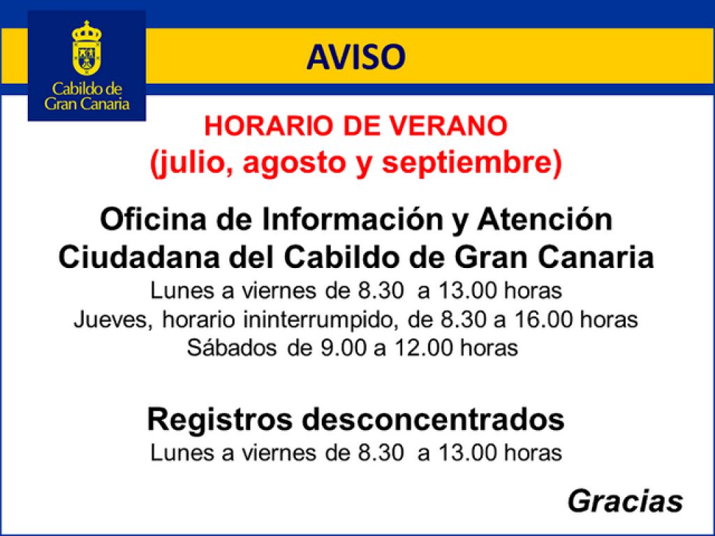 Horario de Verano de la Oficina de Información y Atención Ciudadana y de los Registros Desconcentrados del Cabildo de Gran Canaria