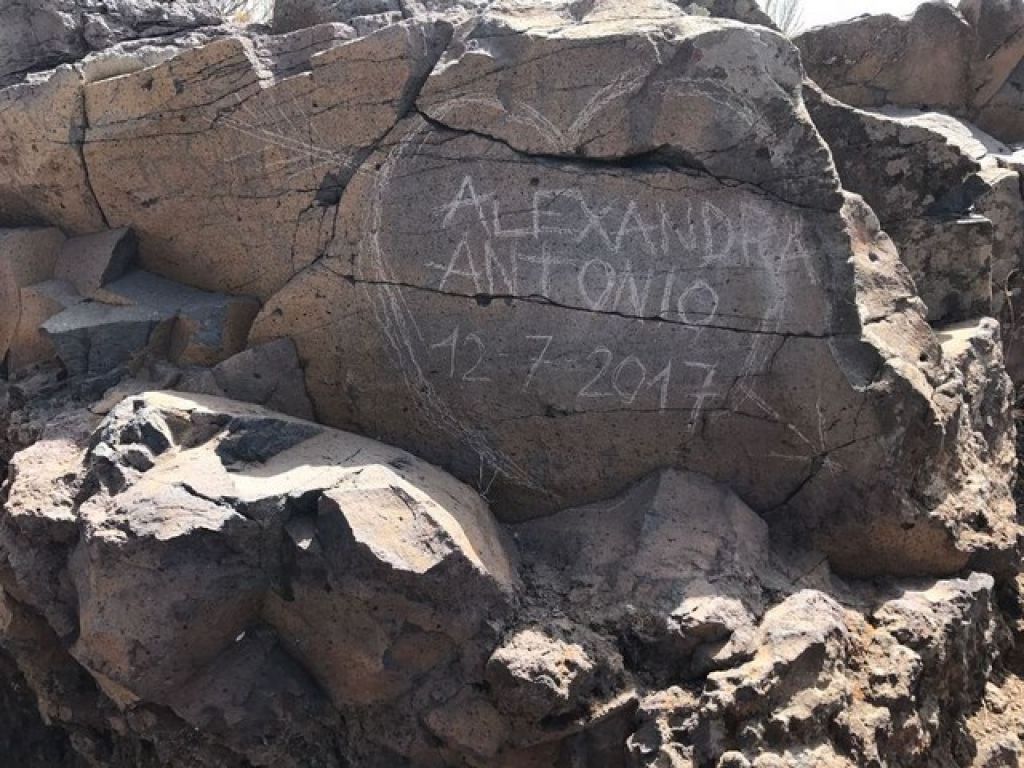 Los daños, muy visibles, cometidos en uno de los afloramientos de basalto que rodean el área excavada conocida como almogarén del Bentayga, fueron producidos por un elemento punzante con el que unos desaprensivos realizaron un grafitti que representa un corazón atravesado por una flecha, en cuyo interior figuran los nombres de Alexandra y Antonio y la fecha 12 de julio de 2017.