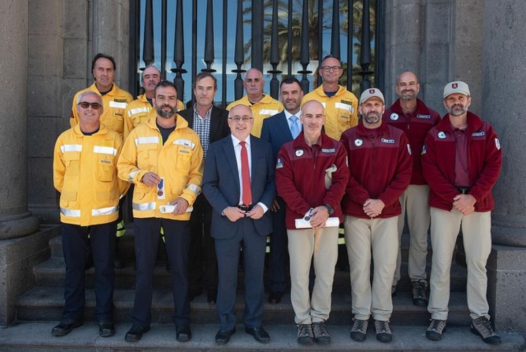 Acompañados por el presidente del Cabildo, Antonio Morales, y la delegada del Gobierno en Canarias, Elena Máñez, recogieron el reconocimiento Bronce con Distintivo Azul el jefe del Equipo Presa, el analista forestal Federico Grillo, y el responsable de la Brigada de Investigación de Fuegos Forestales (BIIF), Juan Carlos Santana, en cuyas espaldas recayó la responsabilidad de afrontar con sus equipos las primeras horas del suceso y la dirección del operativo.