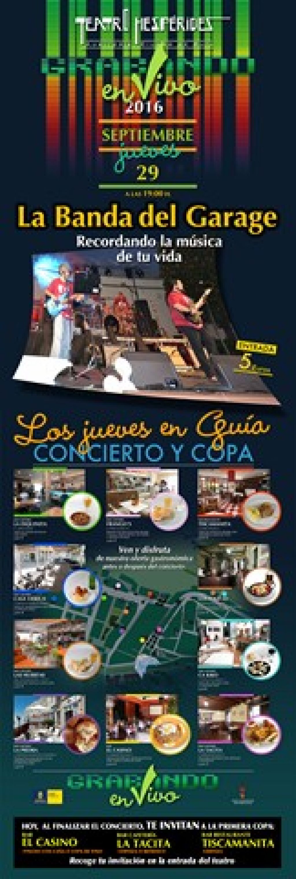 El jueves 29 de septiembre, a las 19:00 horas, y con la actuación de “La Banda del Garage” comienza en el Teatro Hespérides, el proyecto denominado “Grabando en Vivo”, por medio del cual el Ayuntamiento de Santa María de Guía , a través del Área de Desarrollo Local y Empleo, que dirige José Manuel Santana, pone en marcha un proyecto de promoción del desarrollo del municipio con un programa de actuaciones que se enmarcan dentro del Proyecto “Grabando en vivo”, subvencionado por el Cabildo de Gran Canaria a través de su Consejería de Empleo y Transparencia (Servicio de Empleo y Desarrollo Local) , dentro de la Convocatoria de subvenciones en materia de promoción del desarrollo local destinada a Ayuntamientos de la isla de Gran Canaria, anualidad 2016.