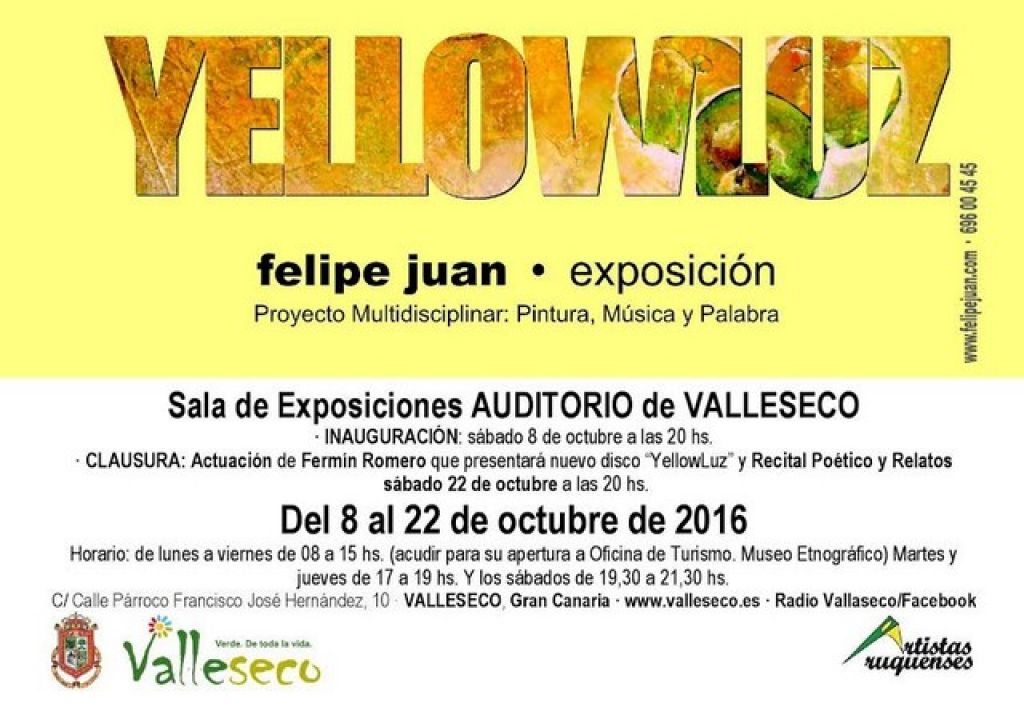 Una vez más, y ya van muchas, Felipe Juan llega hasta el auditorio de Valleseco, donde nos sorprende con un proyecto multidisciplinar, en esta ocasión quiere hacer un homenaje a su color preferido, al color amarillo, en el que interactúan aspectos tales como la pintura, la música, en esta ocasión, aportada por un CD del cantautor Fermín Romero y la escritura, a base de poemas y relatos.