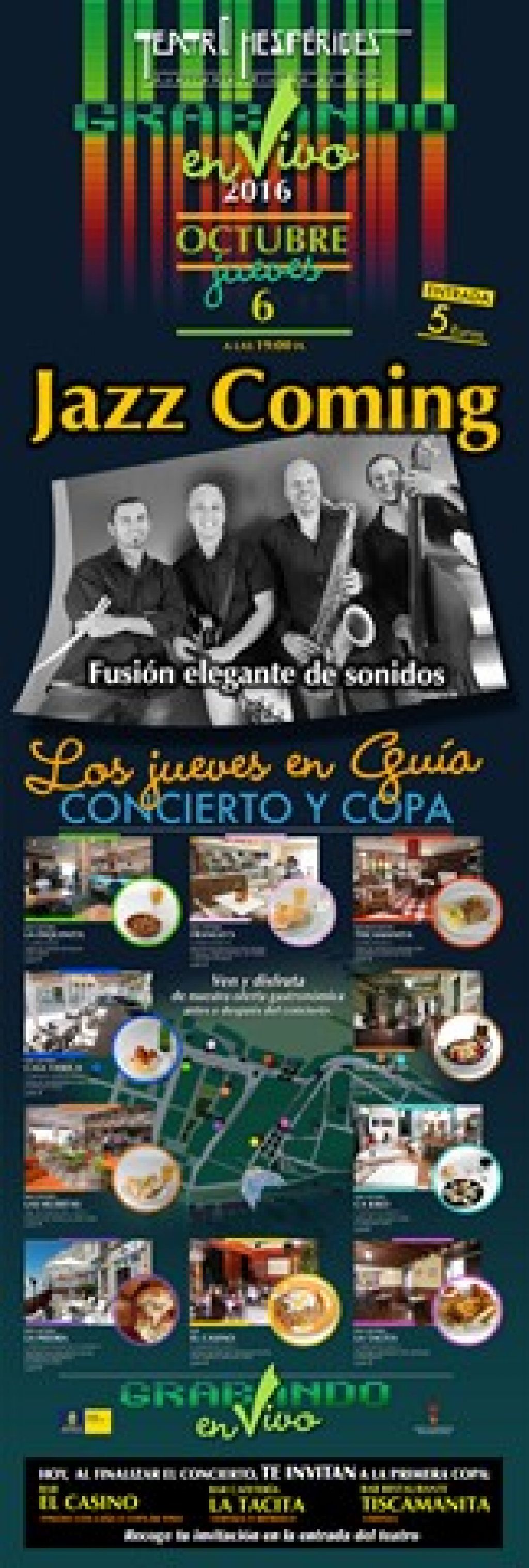Integrada por cuatro destacados músicos canarios, Jazz Comming es una magnífica banda formada por Néstor García (guitarra), Juan Antonio Martín (saxo), Carlos Meneses (contrabajo) y Suso Vega (batería). Desde el año 2009 son habituales en el circuito de los locales de jazz de las islas, donde han ido desarrollando un repertorio basado en arreglos standards con un atractivo sonido “acid jazz acústico”. Además, incorporan composiciones propias y ya preparan la grabación de su esperado primer CD en el que contarán con la participación de algunos artistas de reconocida trayectoria musical.