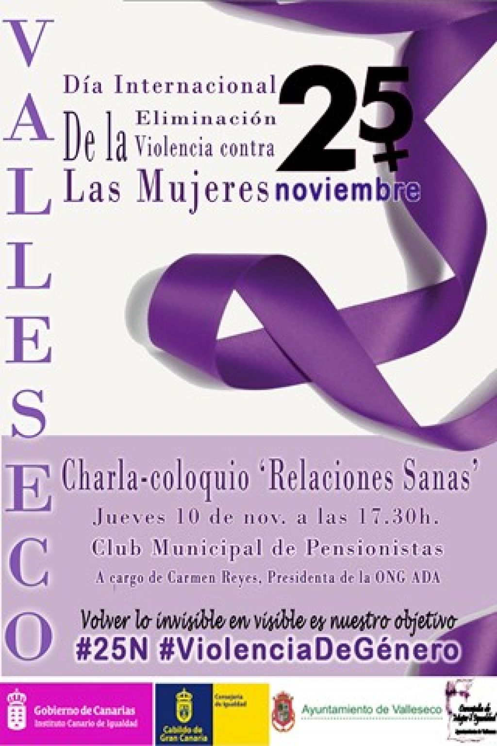 La concejalía de Mujer e Igualdad de Valleseco, dentro de la programación para conmemorar el 25 de noviembre, Día Internacional de la Eliminación de la Violencia de Género, bajo el lema ‘Volver lo invisible en visible es nuestro objetivo’, ha planificado para este jueves 10, a las 17.30 horas, la charla-coloquio denominada ‘Relaciones Sanas’ en el Club Municipal de Pensionistas, con el objetivo de debatir y trazas líneas sobre las relaciones tóxicas y sus consecuencias, la misma será impartida por la Presidenta de la ONG Ada, Carmen Reyes.