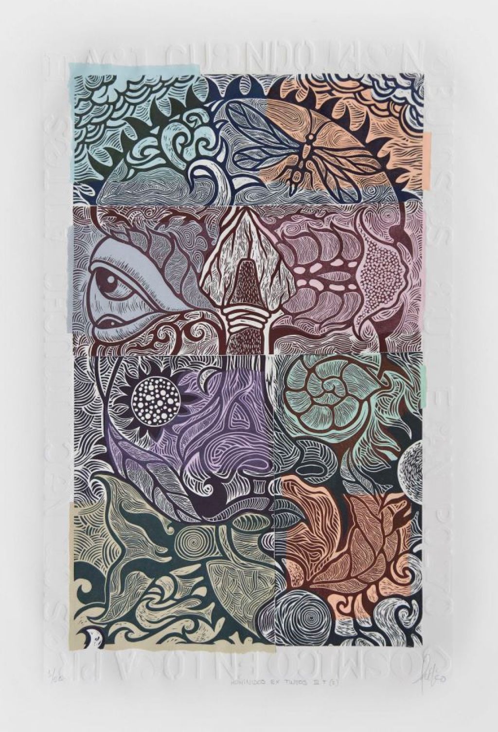 La serie ‘Homínidos extintos’, según Leiko, alude a la frágil certeza que ampara todo lo relativo a la evolución humana como especie. El conjunto exhibido es un compendio de retratos de criaturas posibles que poblaron nuestra prehistoria y que, a fuerza de integración, asimilación y descartes, quedaron estampadas en nuestro ADN. “Son retazos de hombre, de animal, de plantas y todo cuanto habitaba la naturaleza. Los “trozos” se integran y se desgajan para dar lugar a nuevas criaturas, el ciclo tiende al infinito. Cada vez emergen nuevas criaturas que no son otra cosa que nueva distribución de las piezas del puzzle de la vida. El grabado a relieve, con su versátil proceso reproductivo es el camino mágico para moldear mis retratos”, subraya Leiko.