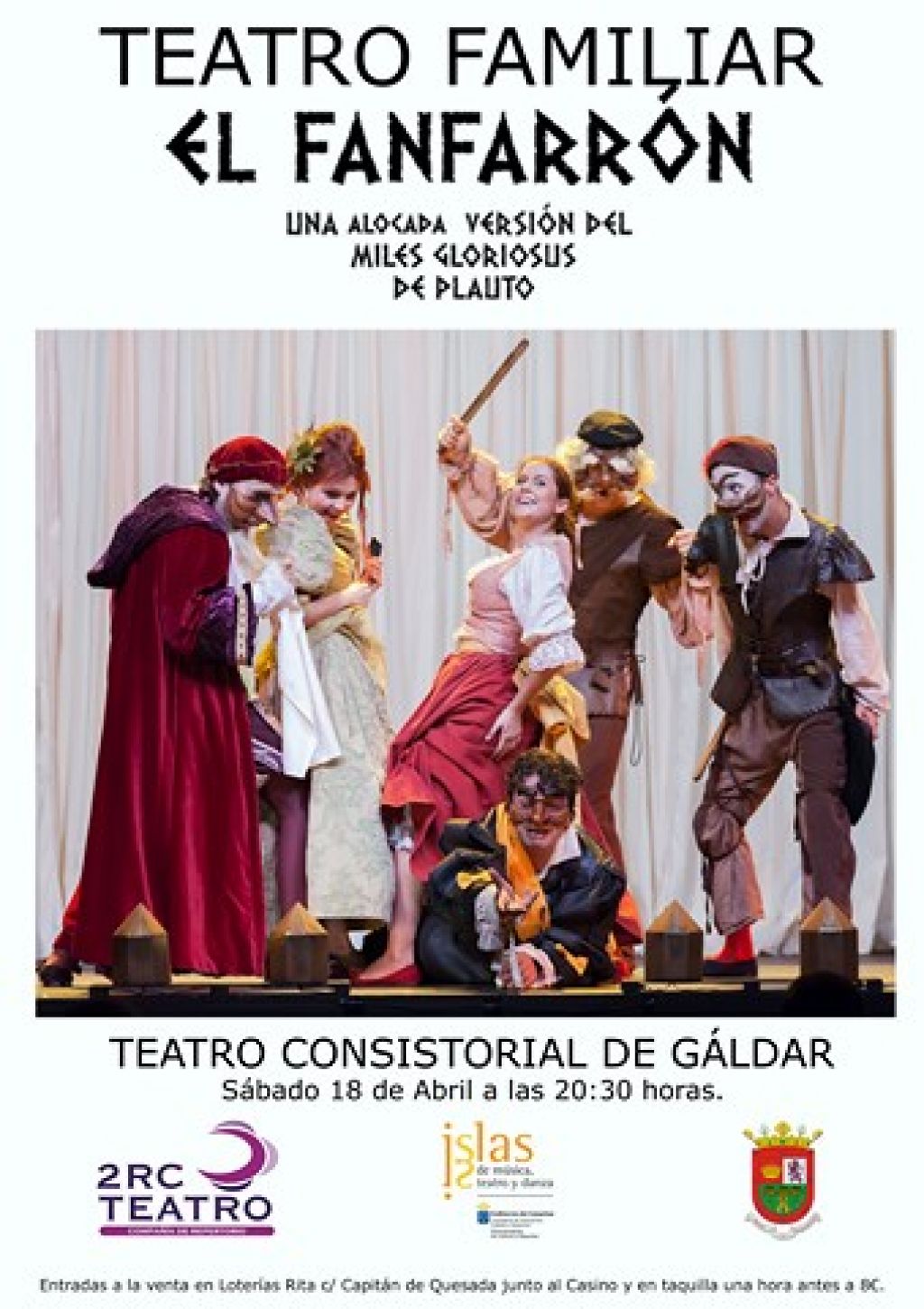 Este sábado 18 de abril, el Teatro Consistorial de Gáldar abrirá sus puertas para acoger en su escenario una "alocada versión" de Miles Gloriosus, de Plauto: "El Fanfarrón", una comedia de enredo que la compañía 2RC Teatro ofrecerá al público galdense. Las entradas ya están a la venta en la administración de Lotería Rita y una hora antes en taquilla.
