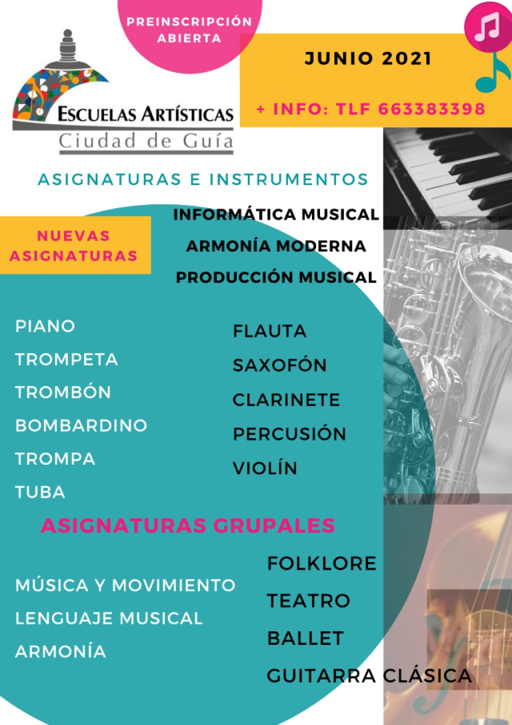 Las Escuelas Artísticas Ciudad de Guía abren del 1 al 15 de junio el plazo de preinscripción de matrícula y lo hace con nuevas e interesantes propuestas para el para el próximo curso, ampliando su oferta formativa con tres asignaturas: Informática Musical, Armonía Moderna y Producción Musical “para dar respuesta a las nuevas demandas que genera la era digital en la que estamos inmersos”, según explica la concejala de Cultura, Sibisse Sosa.
