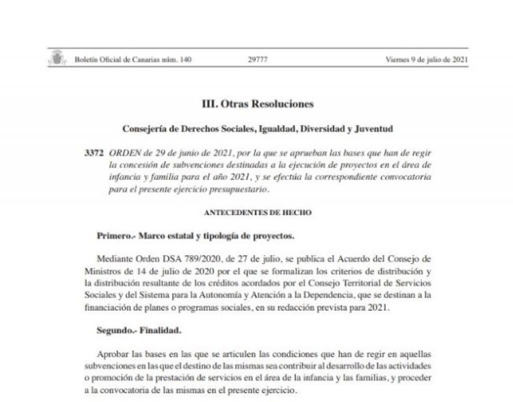 La Consejería de Derechos Sociales, Igualdad, Diversidad y Juventud, a través de la Dirección general de Protección a la Infancia y la Familia, ha publicado en el Boletín Oficial de Canarias con fecha 9 de julio, las bases de la convocatoria de subvenciones que tienen como objeto el desarrollo de acciones destinadas a desarrollar proyectos sociales de apoyo a la infancia y las familias para el año 2021, por un importe global que asciende a 1.814.866,50 euros.