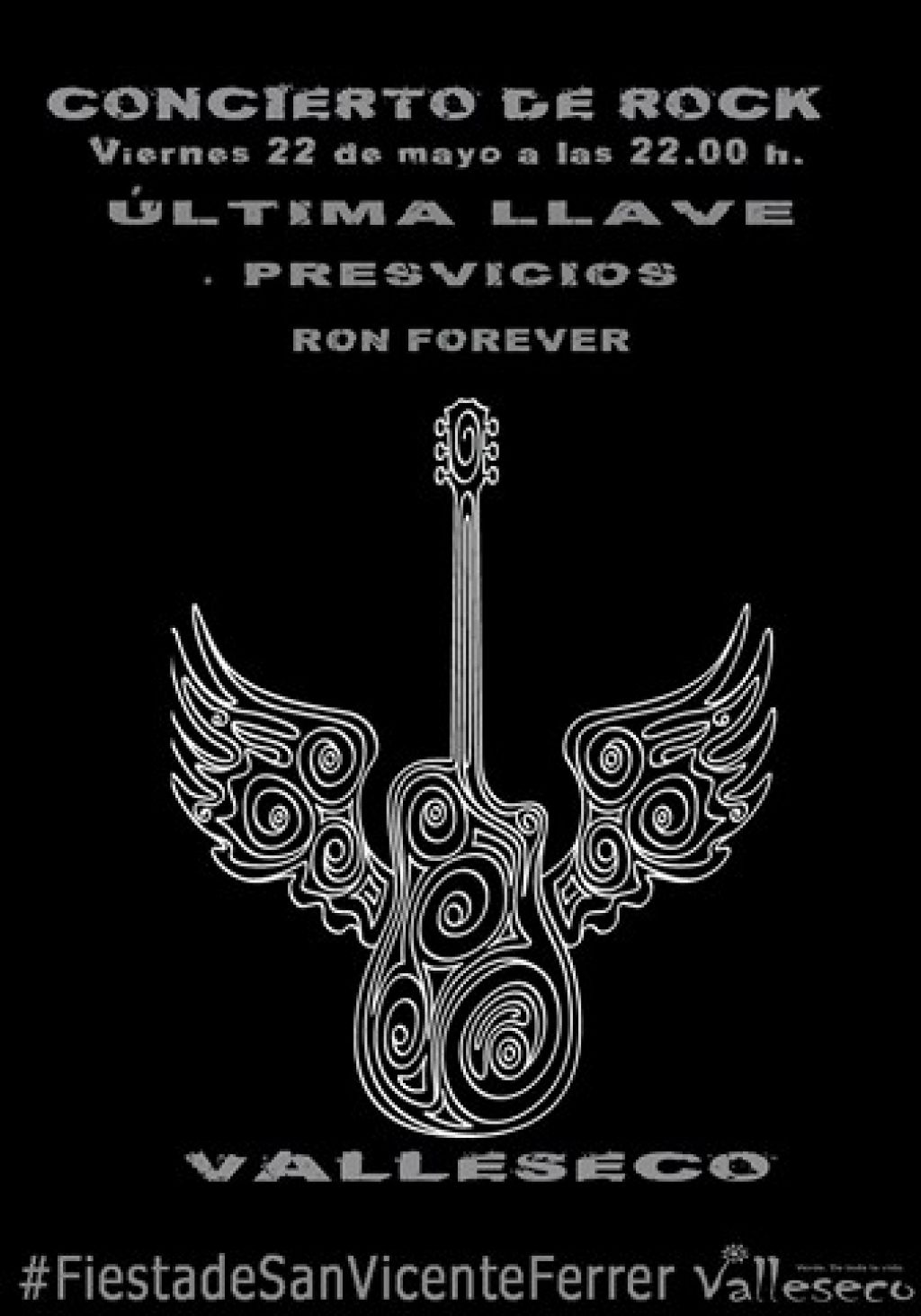 Un directo de tres bandas de rock, "Ron Forever", "Presvicios", y "Última Llave". Y entre las muchas corrientes y vertientes musicales que se darán cita en Valleseco, donde el grupo del momento Última Llave presentará su EP "Eres tú". Un gran concierto que el público de la Isla disfrutara con grandes rockeros y jóvenes promesas, ambos harán que la plaza del pueblo se quede bastante pequeña.