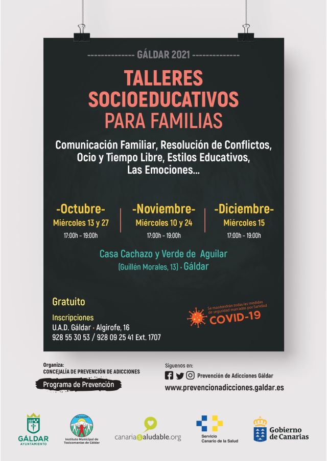 El programa denominado “Talleres Socio Educativos para Familias” se desarrollará desde el mes de octubre a julio 2022 en la Casa Cachazo y Verde de Aguilar de Gáldar en horario de 17:00 a 19:00 horas, durante dos miércoles de cada mes.