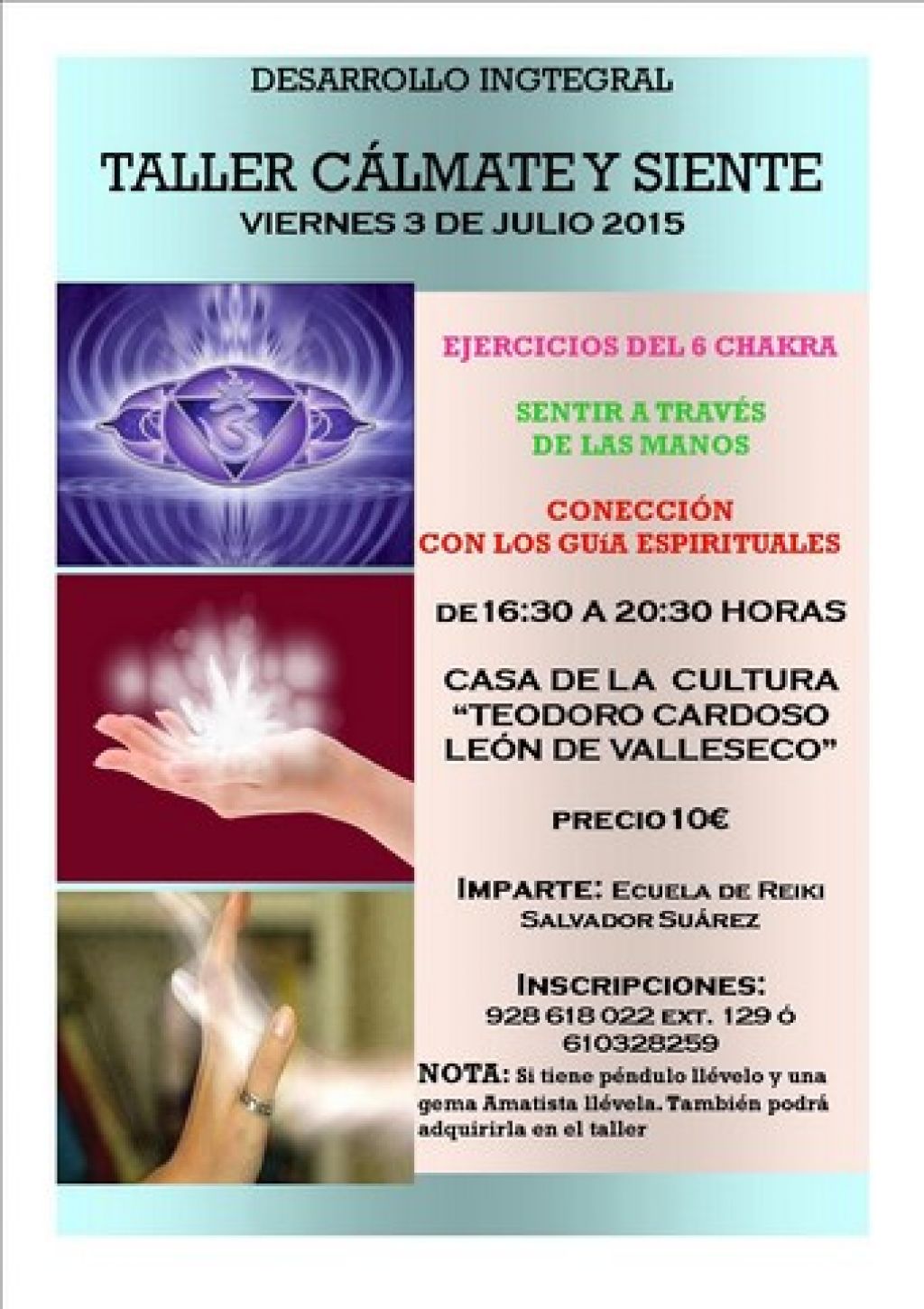 El taller se enmarca dentro la programación de la concejalía de la Universidad Popular "Teodoro Cardoso León" de Valleseco, con el objetivo de satisfacer las necesidades individuales y colectivas, en los ámbitos espiritual, social, cultural y ambiental, de cara a la canalización de la energía a través de las manos. El taller está dirigido a todo el público en general, interesados en despertar su potencial y descubrir más sobre el funcionamiento de la vida, se van a desarrollar en las instalaciones de la Casa de la Cultura del municipio en horario de 16.30 a 20.30 horas, impartido por Salvador Suárez, Gran Maestro Reiki USUI nivel 18. Tendrá lugar este viernes 3 de julio bajo el lema "Cálmate y siente", la actividad tiene un precio de 10 euros, pudiéndose apuntar en la administración de la UP de Valleseco, en los teléfonos 928 61 80 22 ext.129 o 610 328 259.