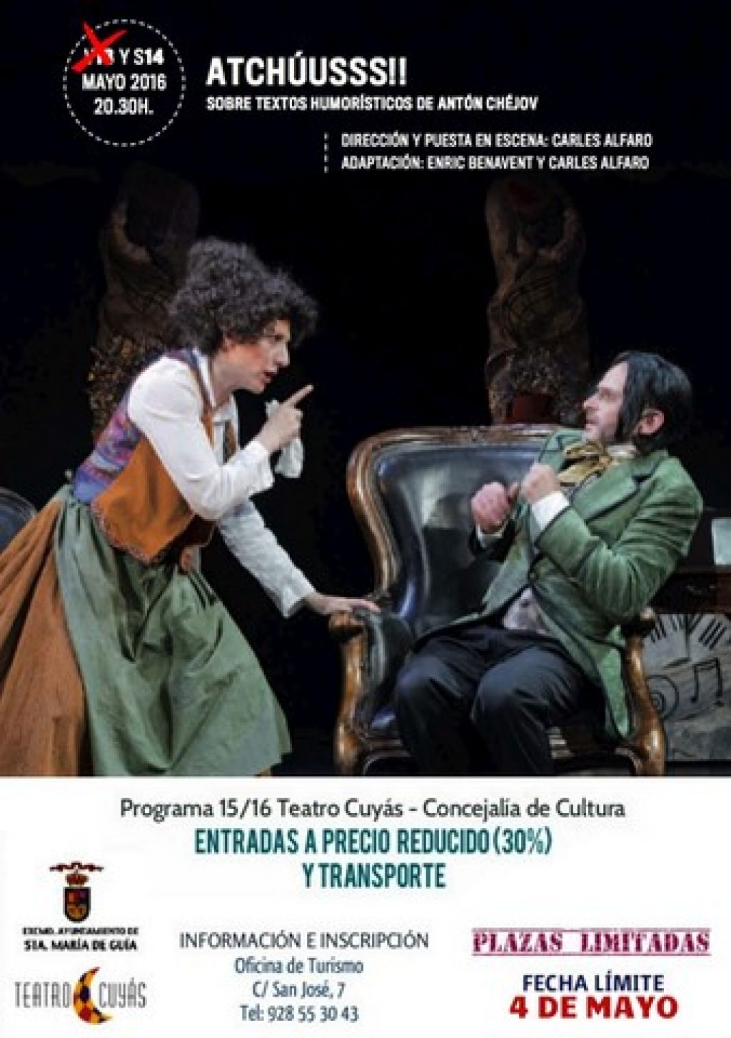 La Concejalía de Cultura, que dirige María del Carmen Mendoza, facilitará de nuevo la compra de entradas a precio reducido (en un 30%), con servicio de guagua incluido, para los vecinos del municipio que deseen asistir a la puesta en escena de la obra “Atchúusss!!” que se representará el próximo 14 de mayo en el Teatro Cuyás. Las plazas son limitadas -anfiteatro bajo y patio de butacas- y el plazo para inscribirse finaliza el próximo 4 de mayo. Las personas interesadas pueden dirigirse al Área de Cultura, en la Oficina de Turismo, (C/ San José 7).