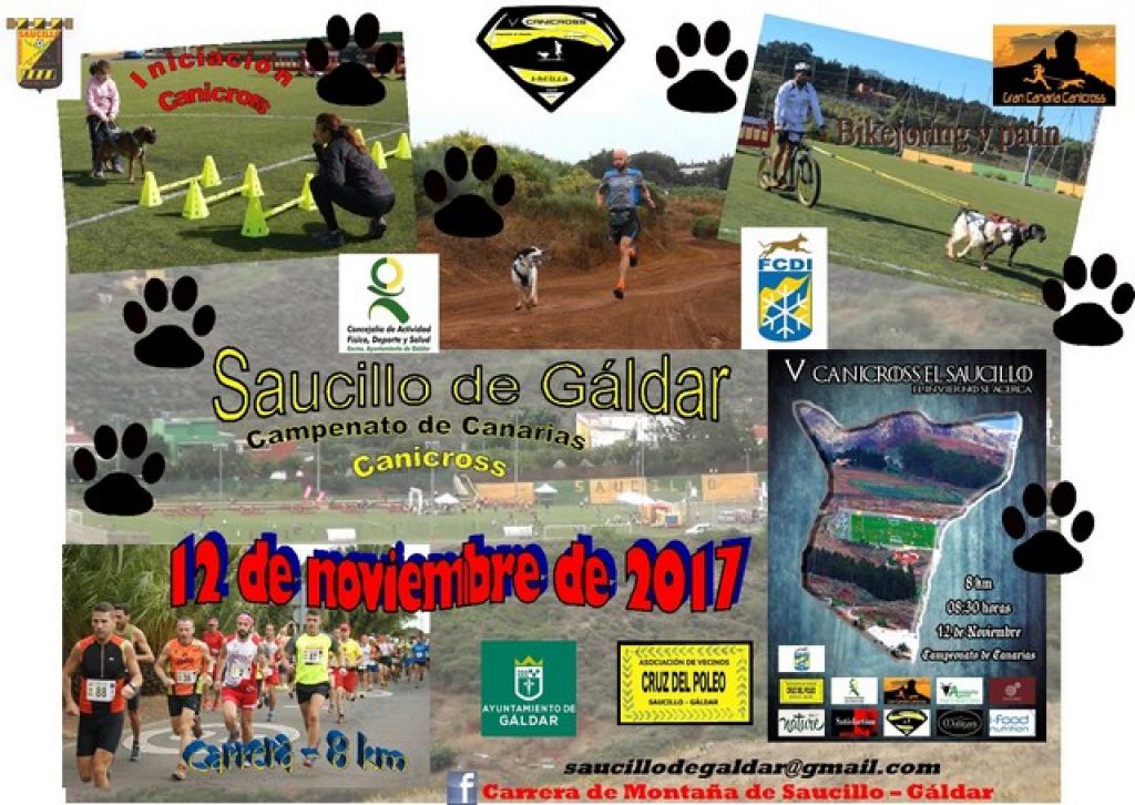 El V Canicross de Saucillo de Gáldar (12 de noviembre de 2017), además de los talleres de iniciación, bikejoring y patín, tendrá como novedad una Carrera de Montaña (8 km) para los que se inician en el mundo del trail con el mismo recorrido del canicross.