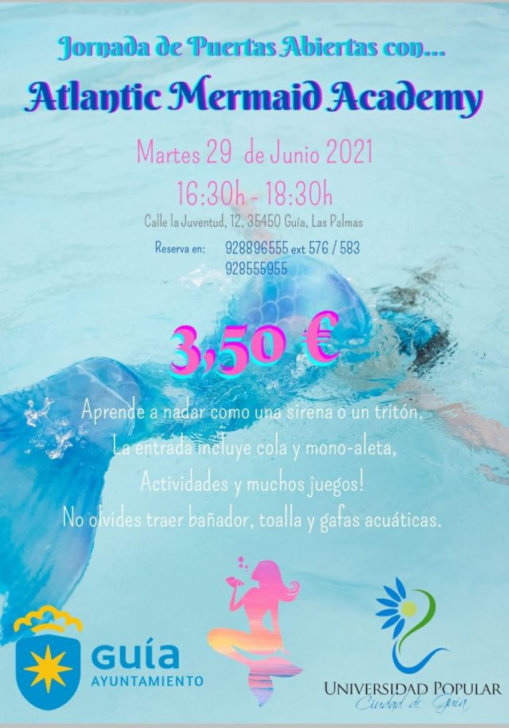 La Universidad Popular Ciudad de Guía ha organizado para el próximo martes 29 de junio una actividad lúdica dirigida al público infantil que desee aprender a nadar como sirenas o tritones. Se celebrará en las piscinas municipales, de 16:30 a 18:30 horas, y podrán participar niños y niñas, a partir de 7 años, que sepan nadar. El coste de la actividad es de 3,5 euros e incluye cola y mono-aleta.
