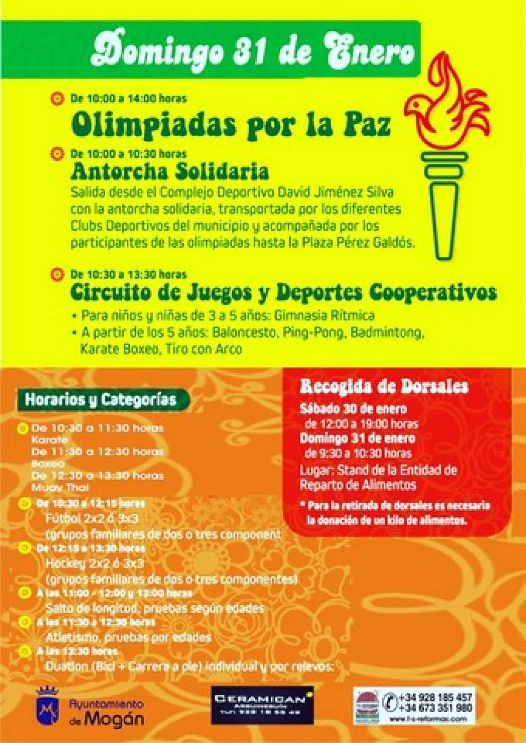 La jornada 'Olimpiadas por la Paz', organizada por la concejalía de Deportes del Ayuntamiento de Mogán, estará dedicada a actividades deportivas destinadas para todos los públicos, pero especialmente para los menores. La obtención de los dorsales para las diferentes actividades y competiciones se conseguirá con la aportación de un kilo de comida, por lo que la jornada, además de fomentar el deporte, promoverá la solidaridad. La retirada de dorsales podrá realizarse el sábado 30 de enero desde las 10:00 hasta las 19:00 horas o el domingo 31 de 9:00 a 10:00 horas en la Plaza Pérez Galdós, en el stand de la entidad de reparto de alimentos, situado en la carpa.