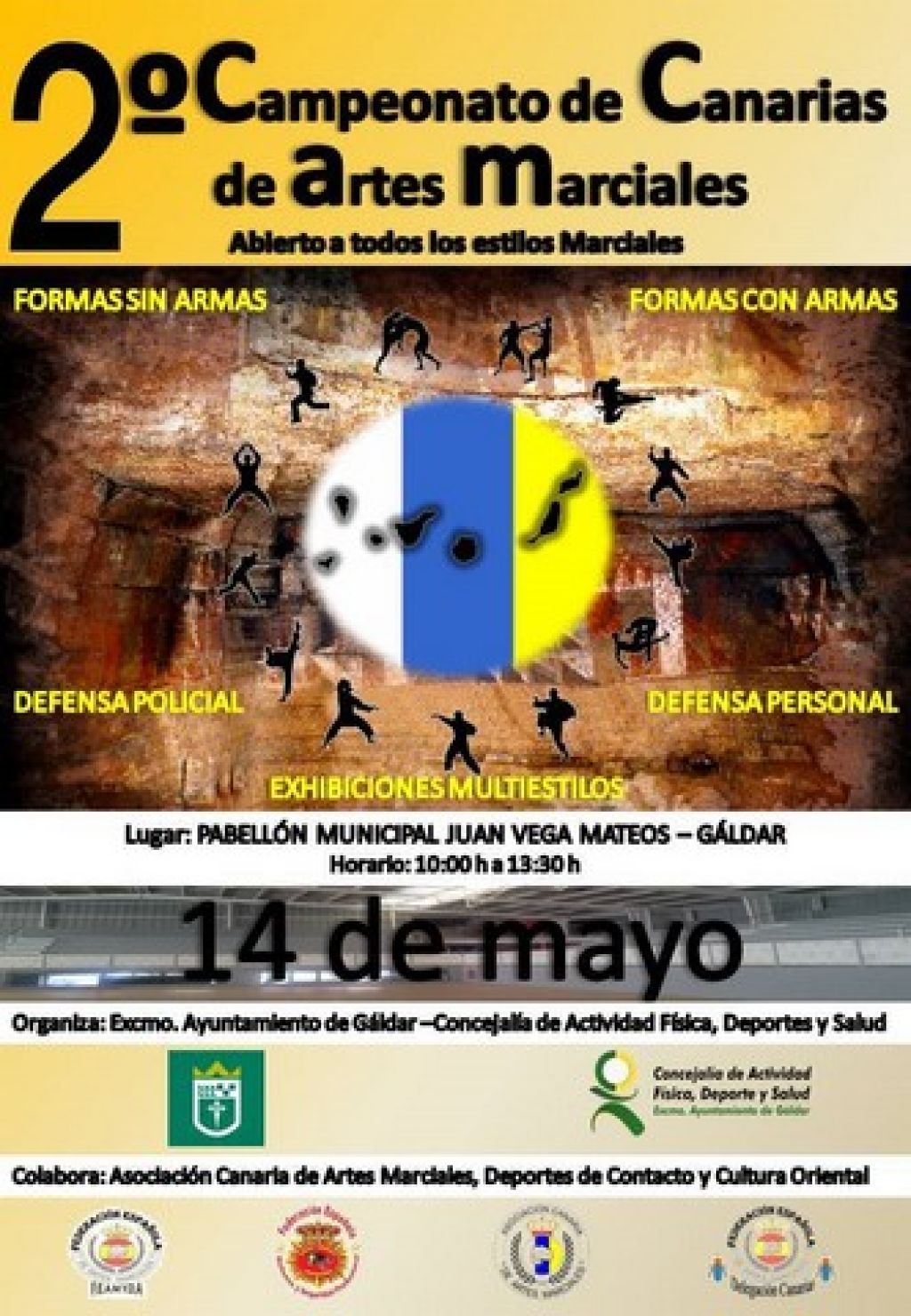 La Concejalía de Actividad Física, Deporte y Salud y el Ayuntaminto de Gáldar que dirige Ancor Bolaños organiza el 2º Campeonato de Canarias de Artes Marciales, con la colaboración de la Federación Española de Artes Marciales y Disciplinas Asociadas y la Asociación Canaria de Artes Marciales. El Campeonato se celebrará el 14 de mayo de en el Pabellón Municipal Juan Vega Mateo en Gáldar, en horario de 10:00 a 13:30 horas.