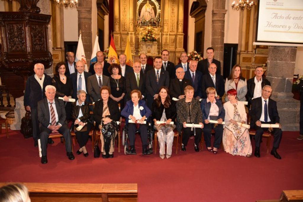 Santa María de Guía rindió este viernes un homenaje a sus hijos ilustres. La Iglesia acogió nuevamente el acto de entrega de Honores y Distinciones que se celebró este año en el marco del 490 Aniversario de la Fundación de esta Ciudad. En un sencillo pero entrañable acto que llenó de familiares, amigos y vecinos el templo matriz, el alcalde del municipio, Pedro Rodríguez, y el presidente del Cabildo de Gran Canaria, Antonio Morales, hicieron entrega de los títulos de Hijos Predilectos, Adoptivos, Medallas de Oro y de Plata y Escudos de Oro a aquellas personas y colectivos que han destacado en su vida profesional o por su dedicación a la comunidad.