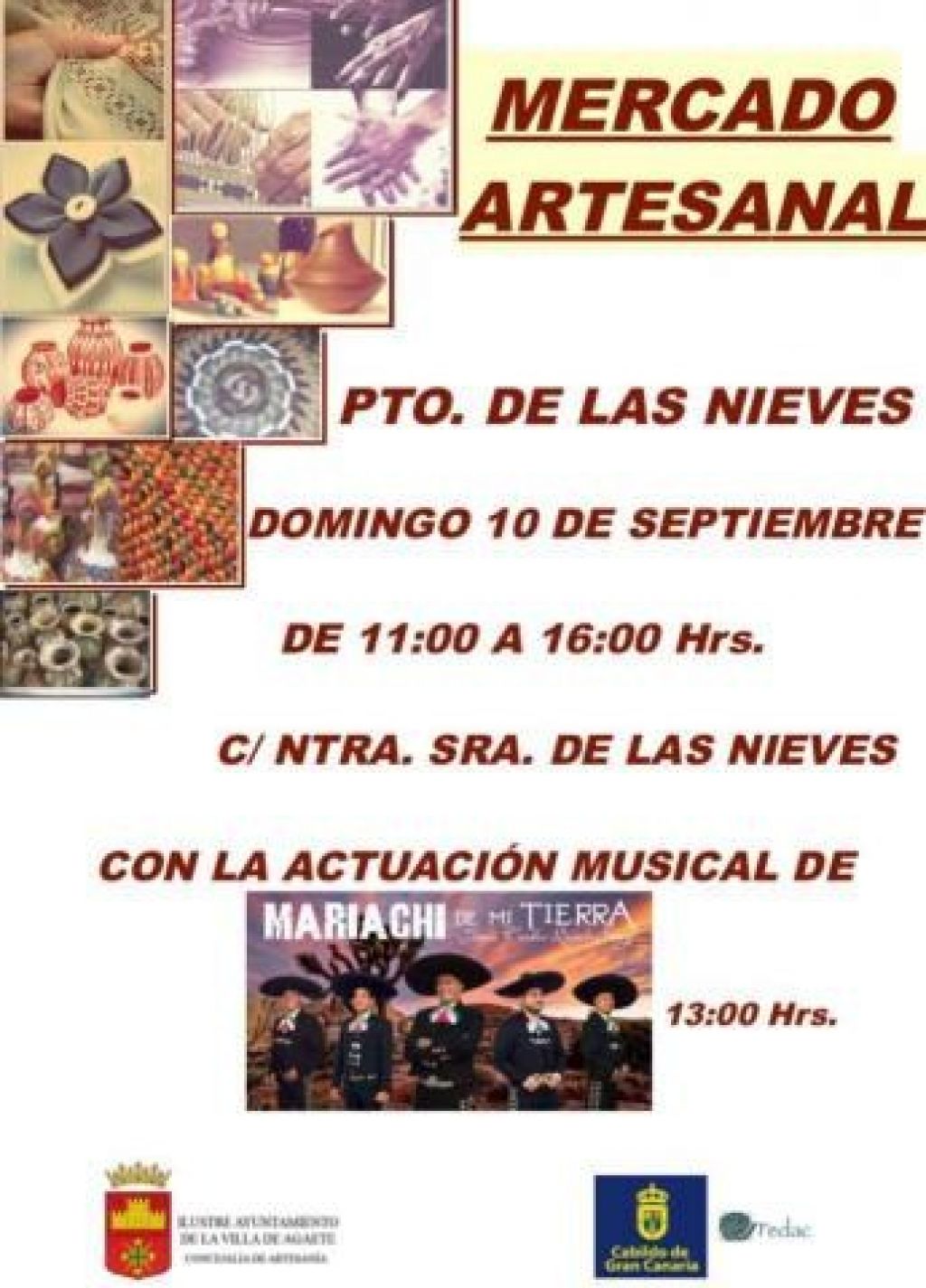 El Mercado Artesanal abrirá las puertas a las 11.00 horas, hasta las 16.00 horas. Además de los productos artesanales, la música tendrá una cita con las vecinas y vecinos de la Villa gracias a la actuación del grupo Mariachi de Mi Tierra que subirá al escenario a las 13.00 horas.