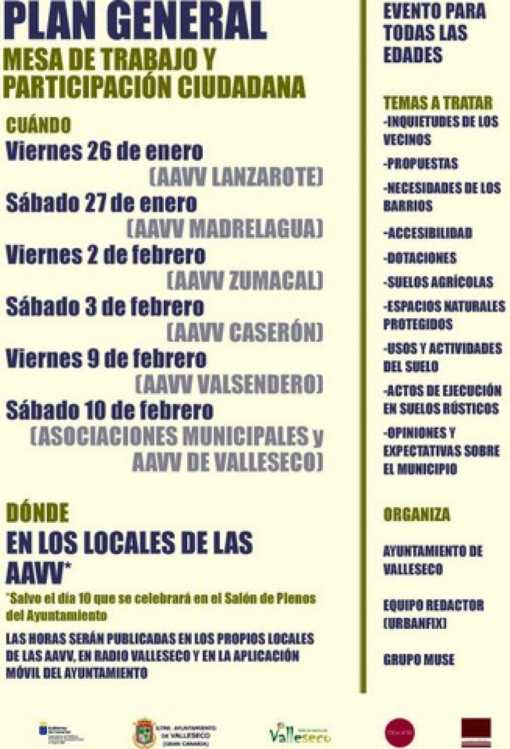 El Ayuntamiento de Valleseco, inicia en la jornada de este viernes 26 de enero, una campaña para que la vecindad participe en la elaboración del Plan General de Ordenación, que regulará el desarrollo urbanístico del municipio en los próximos años.