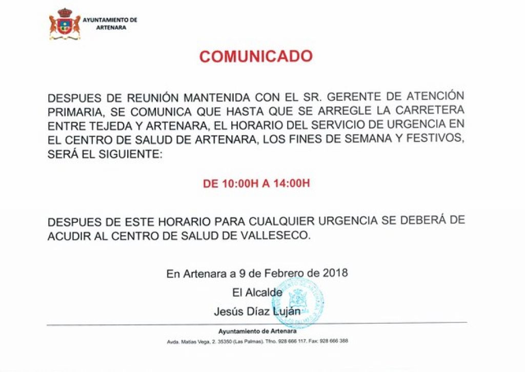 Desde el Ayuntamiento de Artenara ponemos en conocimiento de todos los vecinos información del horario provisional del Servicio de Urgencias del Centro de Salud de Artenara.