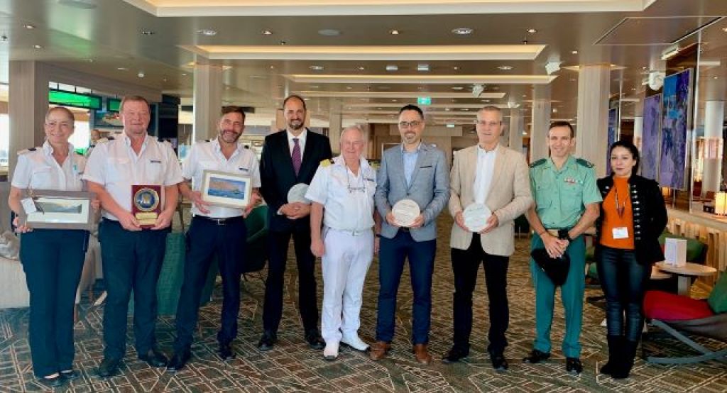 El Puerto de San Sebastián de La Gomera recibió este martes la primera escala del crucero Mein Schiff 2 de la naviera TUI Cruises. Se trata de un buque que inició el pasado 15 de febrero su primera ruta por Canarias, afianzando el crecimiento de este sector en los puertos de la Isla. El acto de bienvenida contó con la participación del vicepresidente segundo, Alfredo Herrera, acompañado por el teniente de alcalde, Eleazar Borrego; el representante de la Autoridad Portuaria de Santa Cruz de Tenerife, Salvador Méndez; el capitán de la Guardia Civil, José Manuel Lebrón; y la representante de la consignataria, Gretel Tomé.