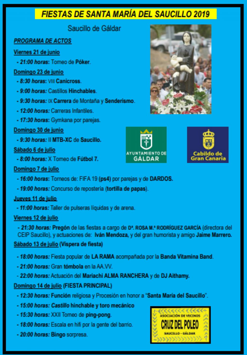 Actos de las Fiestas de Santa María del Saucillo en el barrio de Saucillo de Gáldar del 21 de junio al 14 de julio