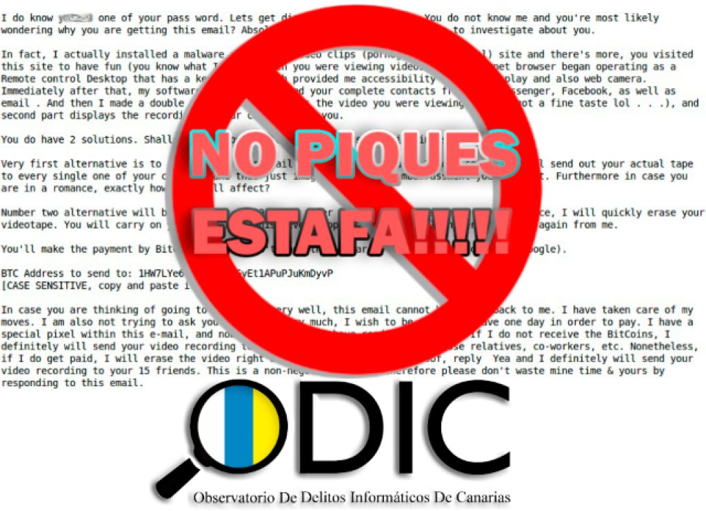 Desde el Observatorio de Delitos Informáticos de Canarias queremos comentarles sobre las advertencias realizadas por la Policía Nacional sobre el envío masivo de correos electrónico de sextorsión. Por si no tienes claro qué es sextorsión, se trata de una nueva estafa a través de las redes, en la que los atacantes simulan haber hackeado el correo electrónico de la víctima para conseguir cobrar un rescate. Tratándose de una forma de chantaje en la que el atacante tiene en su poder fotografías o videos privados de índole sexual de la víctima, y amenaza con hacer público el contenido en caso de no recibir un pago económico. Internet actúa aquí en nuestra contra y a favor del chantajista: le facilita el anonimato e incrementa el impacto potencial de su amenaza. La sextorsion no solo vulneran a hombres y mujeres adultos, sino también a niños, niñas y adolescentes, que bajo engaños facilitan informaciones privadas y luego son amenazados.