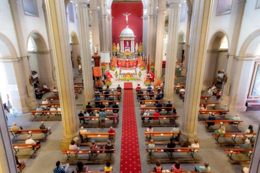 La Iglesia lució más bonita que nunca para este día especial y diferente. Los bancos con los sitios marcados con el sí o el no , señalando la limitación de aforo, o las cámaras que tomaban las imágenes para hacerlas llegar a los hogares galdenses que se dispusieron en sitios estratégicos para que no escapara ningún detalle de esta ceremonia.