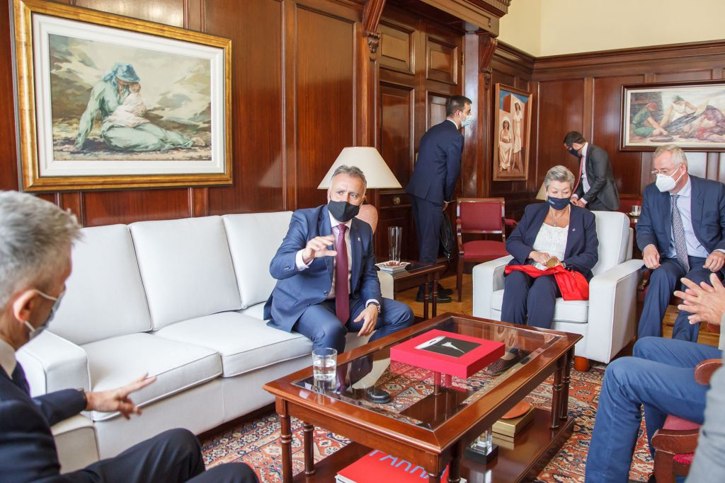 Además, le indicó a la comisaria que, si bien el acuerdo de la UE del 23 de junio para afrontar la crisis socioeconómica de la COVID-19 “fue ejemplar, si bien ahora se necesitará otro por la segunda ola de la pandemia, le faltó una respuesta solidaria sobre inmigración irregular, algo que hay que hacer con urgencia”. El presidente repasó la historia de migración de los canarios a Venezuela, Argentina o Uruguay por la dictadura o el hambre, y recalcó la comprensión del isleño con este fenómeno, pero nunca sin ayuda del resto de instituciones. Recordó también que las administraciones canarias han cumplido perfectamente con sus competencias sobre menores no acompañados, acogiendo durante este año a unos 1.400, e insistió en que la UE y el Gobierno central han de estar al lado de Canarias. Por eso, mostró su disposición a viajar y a ayudar en lo que sea en la visita prevista por Marlaska a su homólogo de Marruecos el próximo 20 de noviembre.