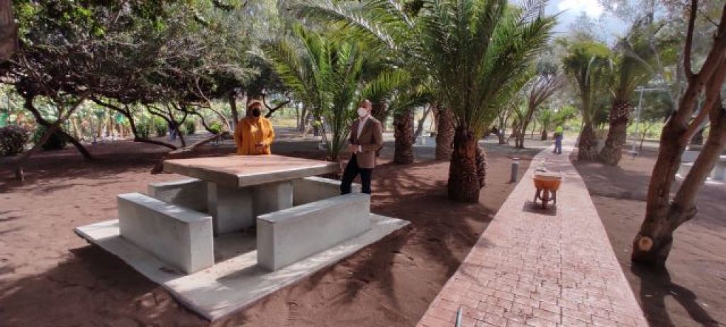 El alcalde de Gáldar, Teodoro Sosa, y la concejala de Parques y Jardines , Carmen Pilar Mendoza Ramos, visitaron las obras de remodelación del área recreativa Huertas del Rey donde se está ejecutando el acondicionamiento y mejora de la zona destinada a mesas y barbacoas ampliando el número de ellas y dotando a este espacio de los servicios necesarios para su uso y disfrute.