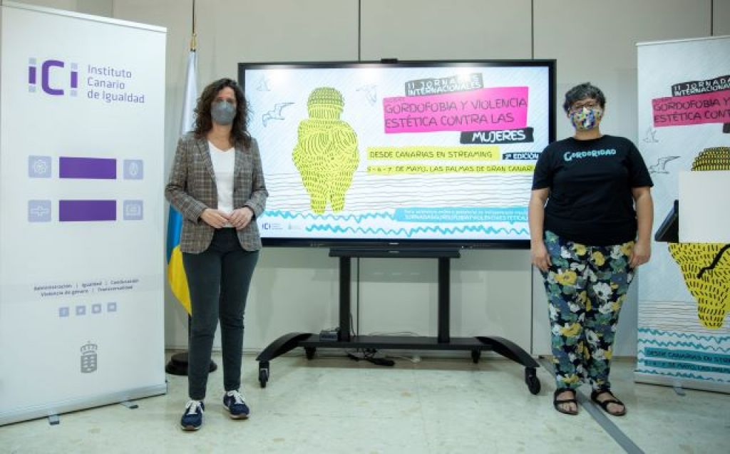 La directora del Instituto Canario de Igualdad (ICI), Kika Fumero, y la experta y autora de la Guía de Gordofobia del ICI, Magda Piñeyro, presentaron hoy la segunda edición de las jornadas internacionales sobre Gordofobia y Violencia Estética contra las Mujeres, organizadas por el ICI, y que en esta ocasión dedicarán tres días, entre el 5,6 y 7 de mayo, a profundizar sobre la cultura de las dietas y las consecuencias sobre los cuerpos y la salud de adultas y niñas.