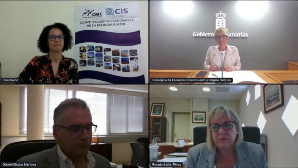 La consejera de Economía, Conocimiento y Empleo, Elena Máñez, intervino este miércoles en la apertura de FARO, feria virtual para el fomento del empleo cualificado vinculado a la Economía Azul en Canarias, acompañada por la directora general de Formación Profesional y Educación de Adultos, Rosario Gañán Pérez; la gerente del Clúster Marítimo de Canarias, Elba Bueno Cabrera, y el gerente del Instituto Tecnológico de Canarias, Gabriel Megías Martínez.