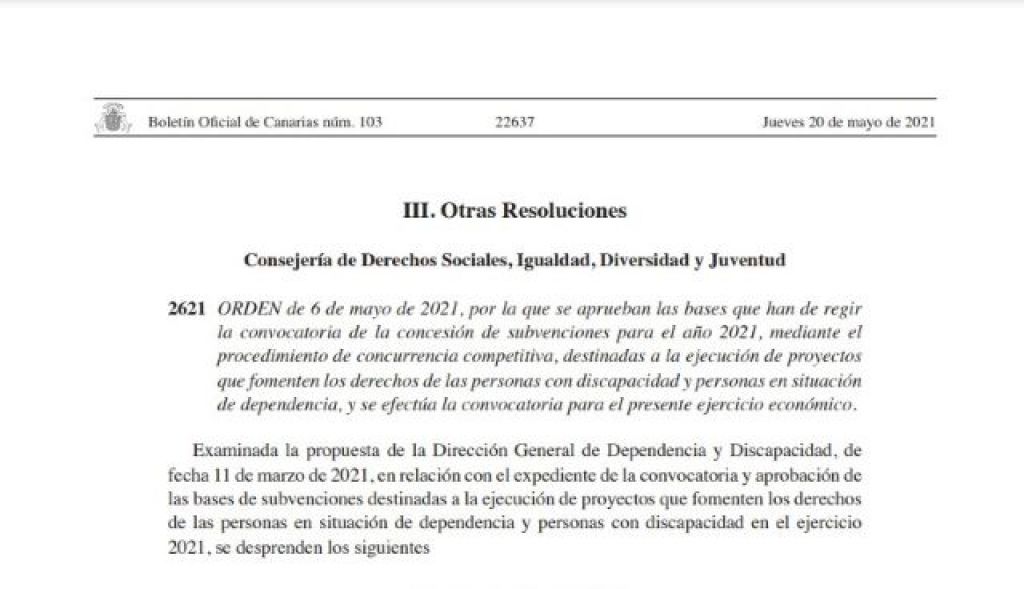 El Boletín Oficial de Canarias (BOC) publica hoy jueves, 20 de mayo, la convocatoria de la Consejería de Derechos Sociales, Igualdad, Diversidad y Juventud para la realización de proyectos que fomenten los derechos de las personas con discapacidad y en situación de dependencia por un montante global que asciende a 5 millones de euros, lo que supone un incremento con respecto a 2020 de 607.095 euros, es decir, un 12,1%.
