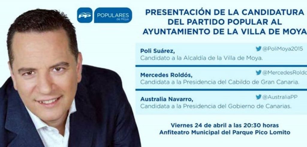 Este viernes a las 20.30 horas, en el Anfiteatro Municipal del Parque Pico Lomito, el Partido Popular de la Villa de Moya presenta su lista de candidatos a revalidar el grupo de gobierno en el Ayuntamiento del municipio norteño, en los comicios del próximo 24 de mayo. Una lista encabezada por el actual alcalde, Poli Suárez, y formada por un total de quince hombres y mujeres, que aúnan juventud y experiencia. Al acto también asisten las candidatas del Partido Popular a la Presidencia del Gobierno de Canarias y a la Presidencia del Cabildo de Gran Canaria, Australia Navarro y Mercedes Roldós. Los medios de comunicación asistentes podrán tomar imágenes y declaraciones de los candidatos.
