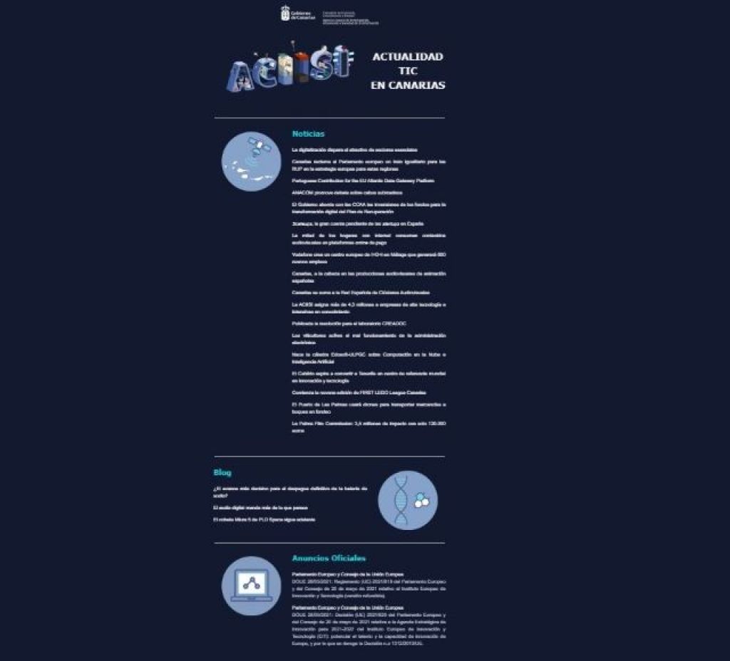 Toda esta valiosa información se canaliza a través de un Boletín de Actualidad TIC en Canarias, que se distribuye diariamente en formato de noticias, anuncios oficiales, convocatorias de subvenciones, eventos y documentos de interés relacionados con la innovación, la digitalización y el sector audiovisual en Europa, España y Canarias.