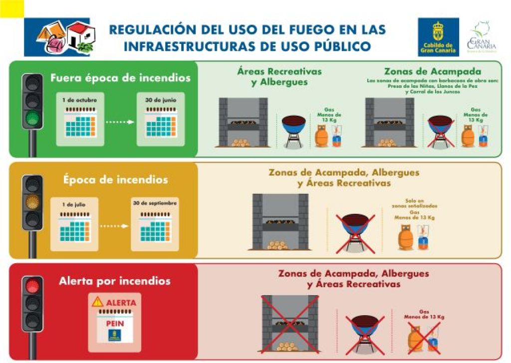 Cuando el Gobierno de Canarias o el Cabildo insular declaren la “Alerta por Riesgo de Incendio Forestal” se prohibirá todo tipo de fuego en las zonas recreativas (incluido el uso de las barbacoas de obra instaladas en estas zonas), y los fuegos artificiales en terreno forestal y en una distancia de 400 metros a su alrededor.