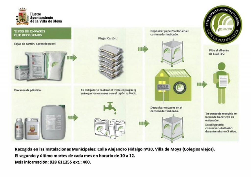 El segundo y último martes de cada mes, a partir del 12 de mayo, la Villa de Moya dispondrá de un punto de recogida de envases de productos fitosanitarios vacíos y limpios, con el logotipo de Sigfito, para su reciclado. Este punto formará parte del Sistema Integrado de gestión de envases vacíos de agrarios y estará operativo en horario de 10 a 12 horas, en la calle Alejandro Hidalgo, número 30, (Colegios viejos) del municipio norteño.
