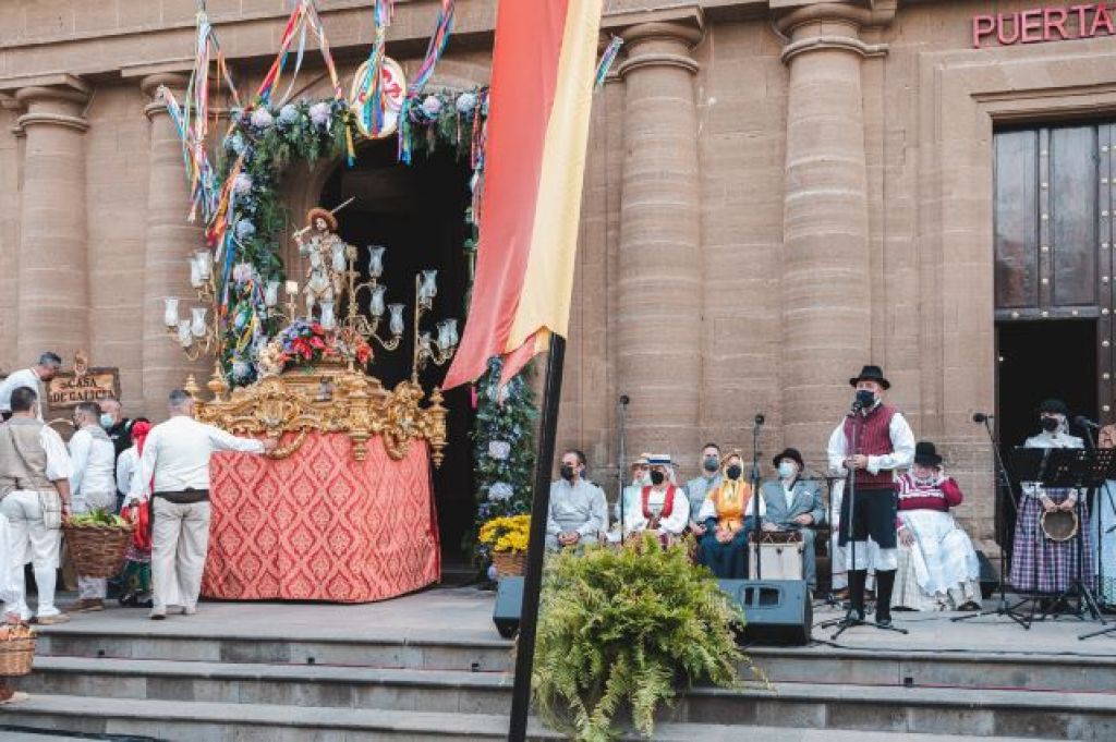 Abriendo la romería los gaiteros de la Casa de Galicia de Las Palmas que comparten con Gáldar a su patrón Santiago y una sorpresa muy especial este año fue la ofrenda del silbo gomero, patrimonio mundial cultural e inmaterial por la Unesco, que llegó hasta Gáldar recorriendo el Camino de Santiago de Gran Canaria a través de la Asociación Cultural del Silbo Gomero y con un mensaje para este municipio que celebra su Jacobeo: “la Diócesis de Canarias desea que este Año Santo favorezca la fraternidad y el cuidado común de nuestro pueblo”.