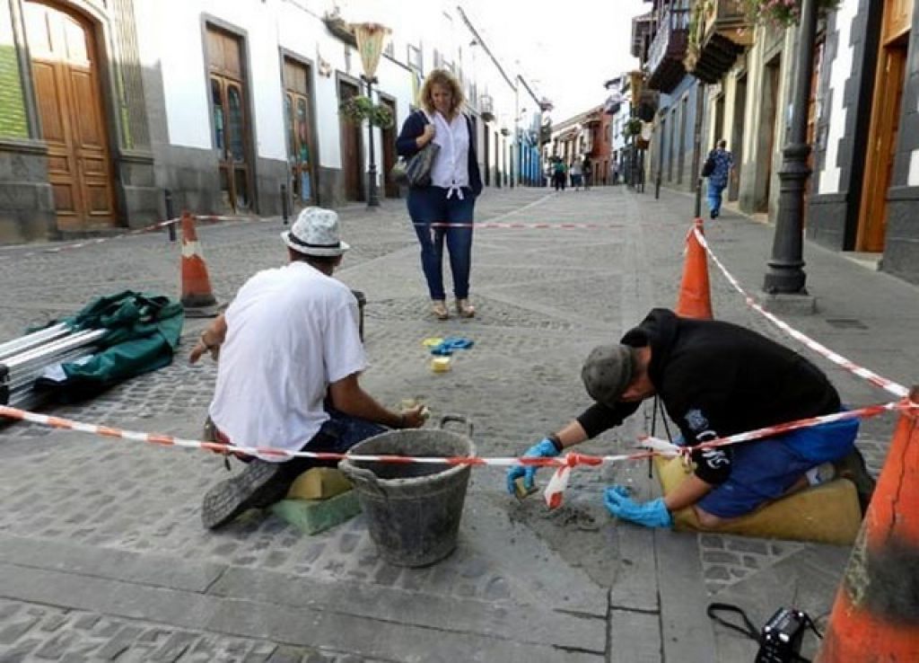 El Ayuntamiento de Teror está restaurando la junta del pavimento de piedra de la Calle Real de la Plaza, rellenando con cemento los huecos entre las piedras con el fin de evitar la irregularidad del suelo. Dos operarios se encargan desde hace unas semanas de realizar el minucioso trabajo, manteniendo y limpiando la piedra vista que configura el tapiz de toda la calle y de la Plaza del Pino.