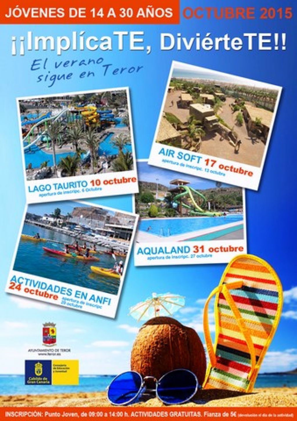 El Ayuntamiento de Teror, a través de la Concejalía de Juventud, prolonga el verano en el mes de octubre poniendo en marcha el programa de actividades acuáticas en el sur de la isla "ImplícaTE, DiviérteTE", subvencionado por la Consejería de Juventud del Cabildo de Gran Canaria, y dirigido a jóvenes de 14 a 30 años de edad. La primera actividad será el 10 de octubre a Lago Taurito; el día 17 se ofrecerá una excursión a Air Soft; el 24 de octubre se realizará una jornada de actividades acuáticas en Anfi; y el 31 de octubre una excursión a Aqualand.