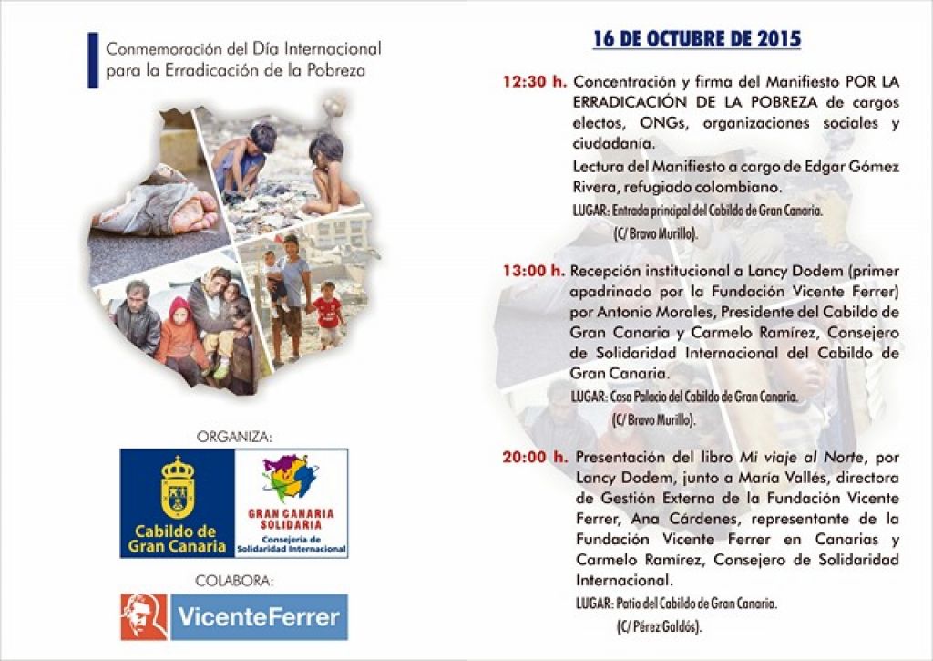 Este viernes 16 de octubre, a las 12:30 horas, tendrá lugar la Concentración y firma del Manifiesto "Por la erradicación de la Pobreza" de cargos electos, ONGs, organizaciones sociales y ciudadanía en general; un acto que tendrá lugar en la sede del Cabildo de Gran Canaria en la puerta principal de la calle Bravo Murillo. La lectura del Manifiesto correrá a cargo de Edgar Gómez Rivera, refugiado colombiano. Es por ello, que el Ayuntamiento de Gáldar a través de la Concejalía de Servicios Sociales y Solidaridad que dirige Ana Teresa Mendoza Jiménez, hace un llamamiento a la población galdense para sumarse a este acto y a su justa causa.