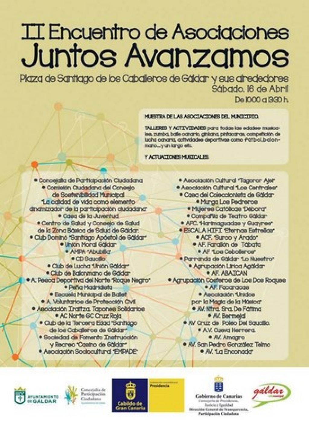 La Concejalía de Participación Ciudadana del Ayuntamiento de Gáldar, que dirige Nuria Esther Vega Valencia, ha informado que se celebra este sábado 16 de abril, el II Encuentro de Asociaciones “Juntos Avanzamos”, tomando como escenario la Plaza de Santiago de los Caballeros de Gáldar y sus alrededores, en horario de 10.00 a 13.30 horas. Este encuentro ha sido diseñado y organizado por un equipo compuesto por nueve asociaciones del municipio, la comisión ciudadana “La calidad de vida como elemento dinamizador de la Participación Ciudadana” y la Concejalía de Participación Ciudadana. Las conclusiones y la evaluación del primer encuentro fueron muy positivas, quedando la sensación general de que había que repetir esta actividad y que fueran las propias asociaciones las que se involucraran desde el principio en el diseño de la misma para que la pudieran sentir como propia.