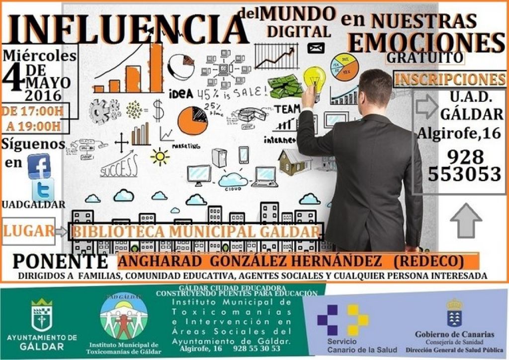 Este miércoles 4 de mayo, tendrá lugar en el salón de actos de la Biblioteca Municipal de Gáldar, un nuevo taller organizado por el Instituto Municipal de Toxicomanías dentro del proyecto “Gáldar ciudad educadora construyendo puentes para la educación”. El taller lleva por título “Influencia del mundo digital en nuestras emociones”. Dicha actividad será impartida de 17:00 a 19:00 horas por Angharad González Hernández, del equipo de profesionales de Redeco.